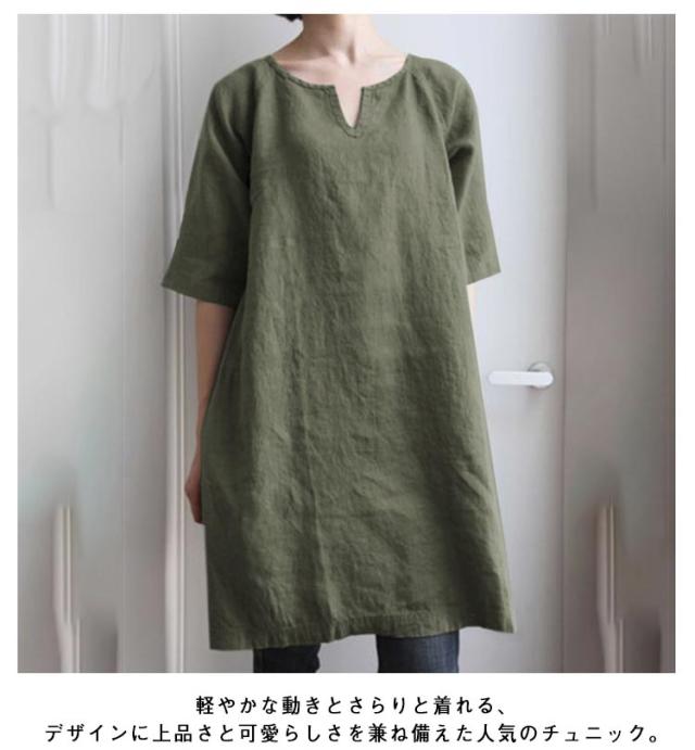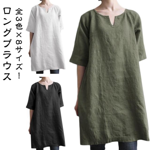 夏 レディース トップス チュニックワンピース カジュアル チュニック 半袖 ロングTシャツ ブラウス リネン シャツ 大きいサイズ 大人 可愛い ロングTシャツ 部屋着 ルームウェア 無地 スキッパー 体型カバー おしゃれ
