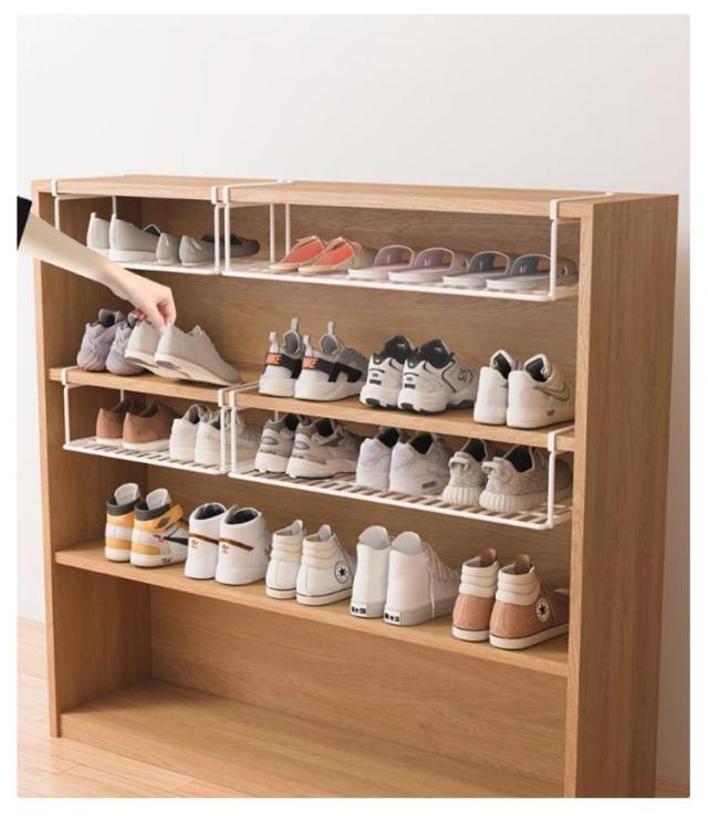 | 下駄箱やシューズクロークの棚下に差し込むだけで、靴箱下の空間を有効活用できる伸縮シューズラック。 横幅は約44〜77cmの間で自由に伸縮でき、設置場所に合わせて使えます。 | |