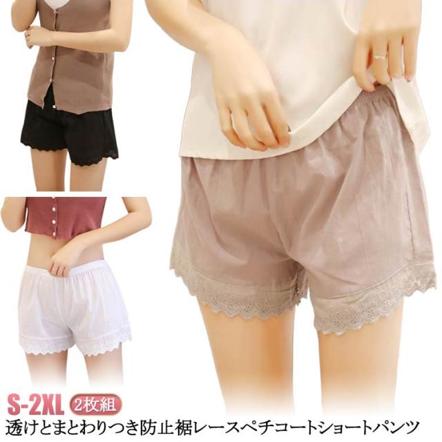 膝上 ペチコート 2枚組 ペチパンツ 綿 インナーパンツ パンツ ショート ペチコート 裾レース付きペチパンツ レディース 刺? シンプル ホワイト ナチュラル 大きいサイズ ルームウエア 白 黒 ブラック レース