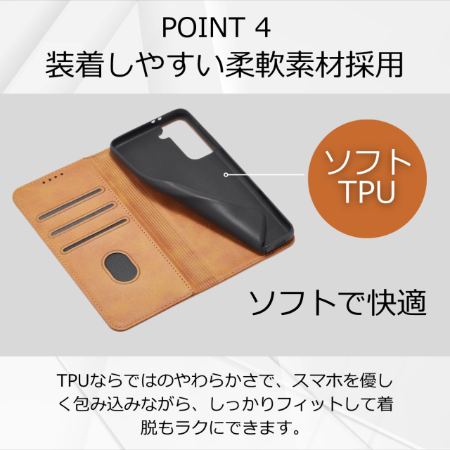 外側は高級感のあるPUレザー、内側は衝撃をやわらげるTPU素材を採用し、大切な端末をしっかり保護します。