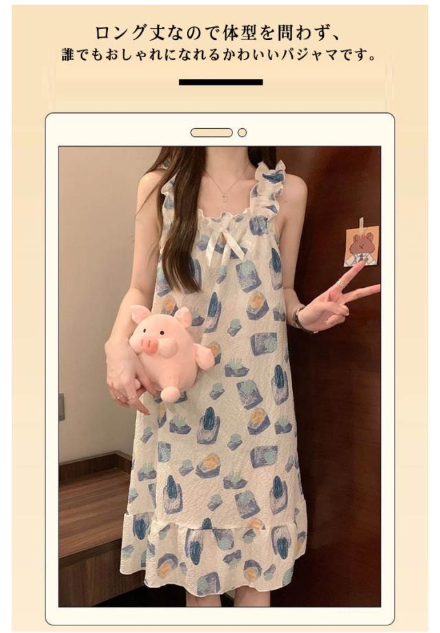 | カップ付き!夏の季節にピッタリな可愛いキャミソールワンピース。 肌触りが気持ちよい生地で、吸水性や通気性に優れており、汗をかいてもさらっとしていて、夏場は最適です。ふんわり柔らかな着心地。 ロング丈なので体型を問わず、誰でもおしゃれになれるかわいいパジャマです。 1日お家の中にいる休日ならルームウェアとしてずっと着ていてもOK!お部屋でのリラックスタイムにはもちろんオススメ。 | |