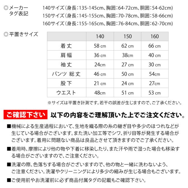 | サイズ | 140サイズ (身長:135-145cm、胸囲:64-72cm、胴囲:54-62cm) 150サイズ (身長:145-155cm、胸囲:70-78cm、胴囲:58-66cm) 160サイズ (身長:155-165cm、胸囲:76-84cm、胴囲:62-70cm) |