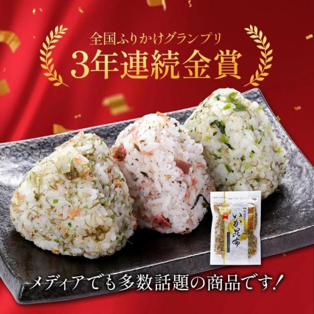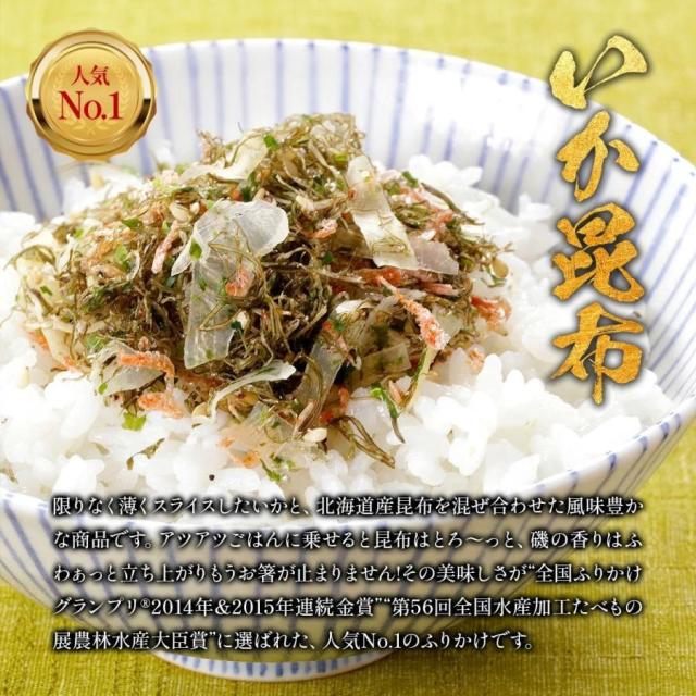 【原材料】調味いか(いか、砂糖、食塩)、調味昆布(昆布、醸造酢、還元水飴)、ごま、ツノナシオキアミ、砂糖、食塩、アオサ/調味料(アミノ酸等)、ソルビット、(一部にいか・ごまを含む)
