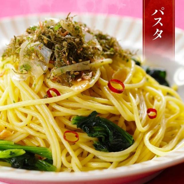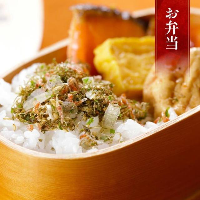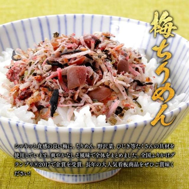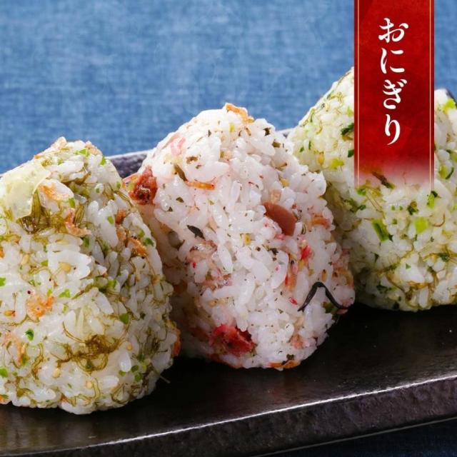【原材料】調味梅(梅肉、砂糖、その他)、ちりめん、ごま、ツノナシオキアミ、乾燥しそ(しそ、食塩)、調味野沢菜(野沢菜、食塩、ぶどう糖、砂糖)、鱈すり身加工品(鱈、小麦澱粉、その他)、調味ひじき(ひじき、砂糖、食塩、その他)、わかめ/調味料(アミノ酸等)、ソルビット、酒精、酸味料、着色料(赤102)、(一部に小麦・ごま・大豆を含む)