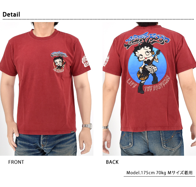 1920年代〜40年代にアメリカでワークウェアを中心とした製品を世に送り出したブランド「The BRAVE-MAN」から「BR×BETTYコラボ フロスト加工半袖Tシャツ(BBB-2515)」のご紹介です。 大きな瞳とぽってりした赤い唇が印象的な女の子、ベティ・ブープ(Betty Boop)。 今回は、ベースにフロスト加工を施したヴィンテージ感のある半袖Tシャツです。 背中にはギターをかき鳴らすロックなベティが刺繍で描かれています。 フロント左胸にはベティのアイコンをワンポイントでデザイン。 左袖にはロゴがプリントしてあります。 ボディーには、ややしっかりとした刺繍に負けない強さを持ったTシャツ生地を採用。 | |||||||||||||||||||||||||