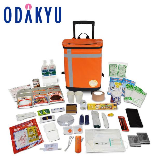 パンx1、主食x4、副食(煮込みハンバーグ)x4、副食(筑前煮)x4、甘味物・氷砂糖x1、お茶x2、保存飲料水(500ml)x2、発熱剤x1、加熱袋x1、ラップフィルムx1、フォークスプーンx2、カップx2、FMラジオ付多機能ライトx1、ボールペン付メモ帳x1、マスクx2、トイレットペーパーx1、簡易トイレセット(3枚入)x2、使い捨て下着(男女兼用)x2、アルコールティッシュx1、歯ブラシx2、ガーゼ付救急絆創膏x2、医療用体温計x1、圧縮タオル(大)x2、耳栓x2、アルミシートx2、収納ポーチx1、ろ過フィルターx2、布粘着テープx1、軍手・笛・ロープセットx1、雨衣x2、カッターナイフx1、ごみ袋x2、アルミシェラフx2、手鏡付裁縫セットx1、拡大レンズ(大)x1、名札x1、防災マニュアル・内容物一覧x1