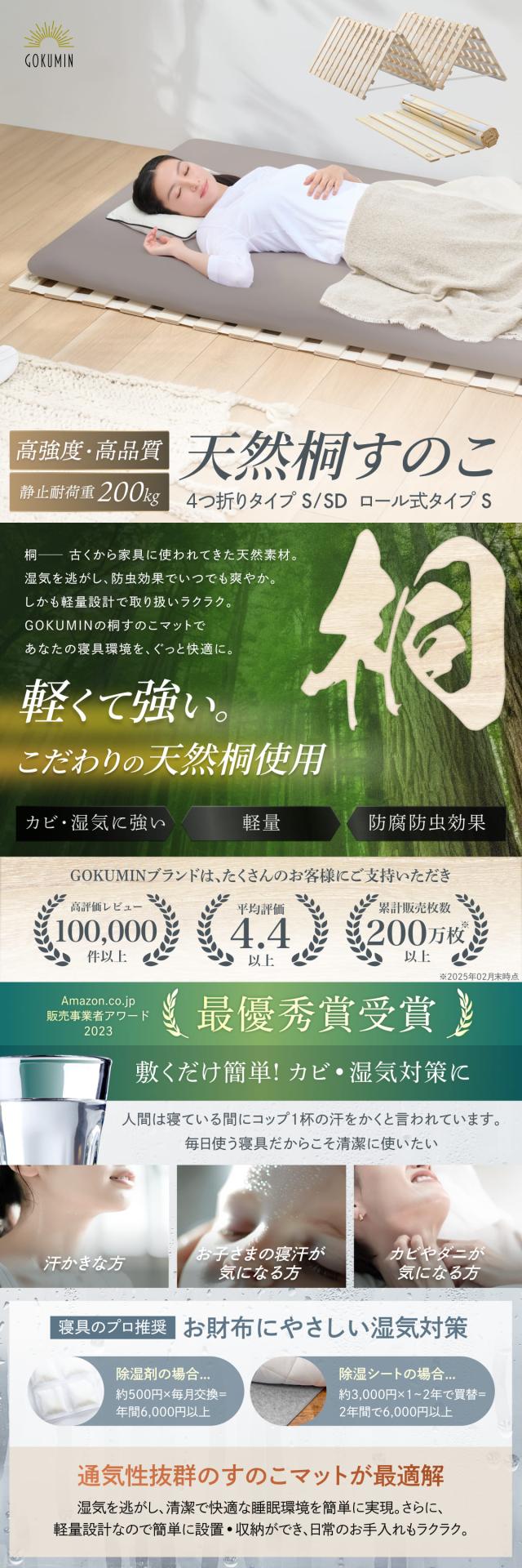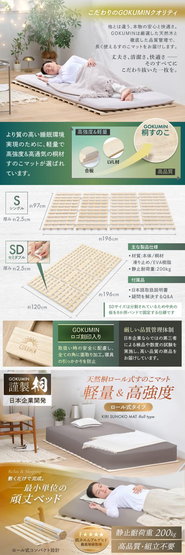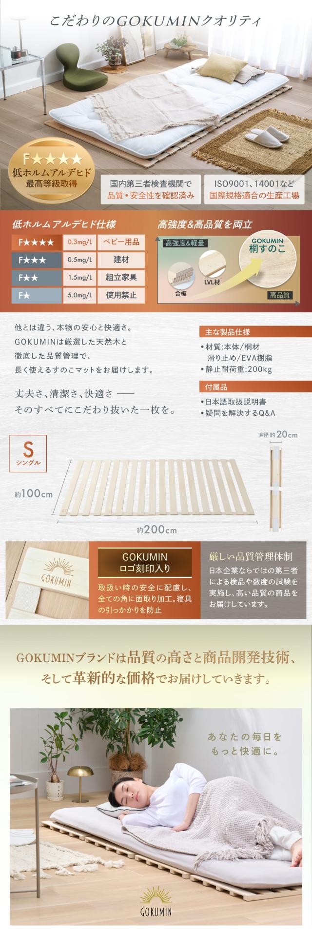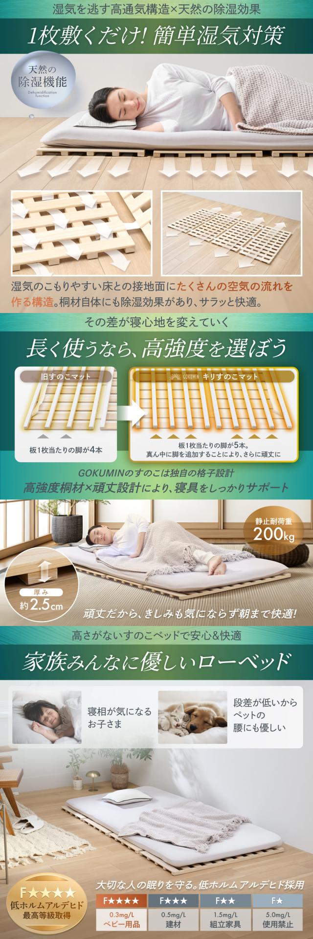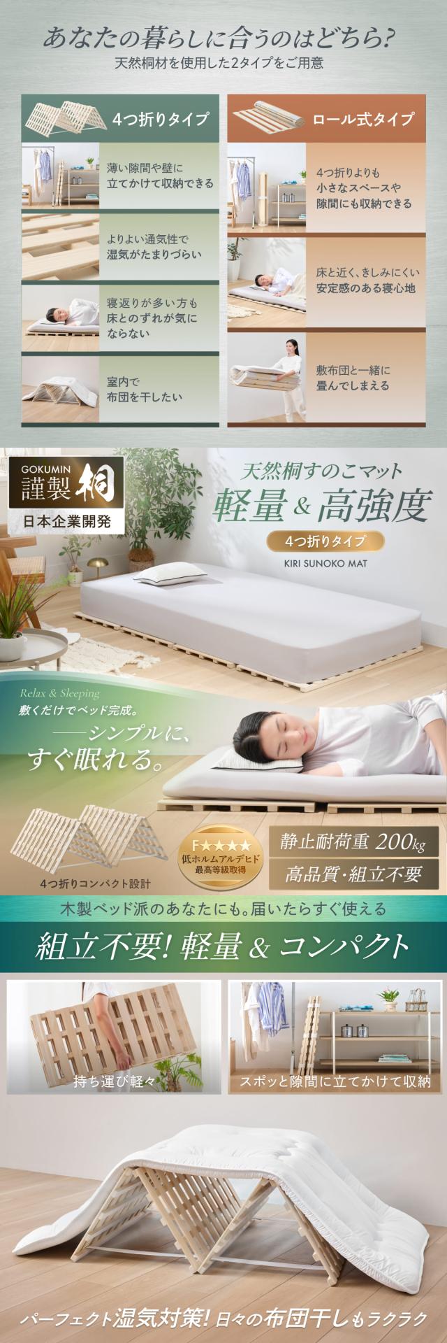 すのこマット シングル 桐 すのこベッド GOKUMIN ロール式 四つ折り 4つ折り 頑丈 通気性 除湿 軽量 防腐 防虫 四つ折り コンパクト 組立不要 国産 天然 すのこ 1年保証 滑り止め 傷防止 室内干し 折畳 折り畳みベッド 湿気 結露対策