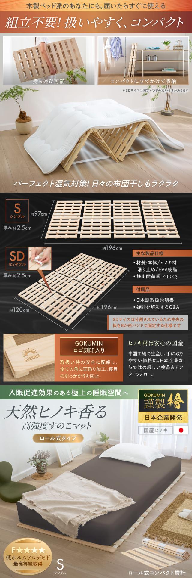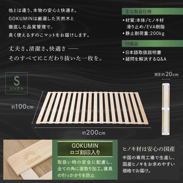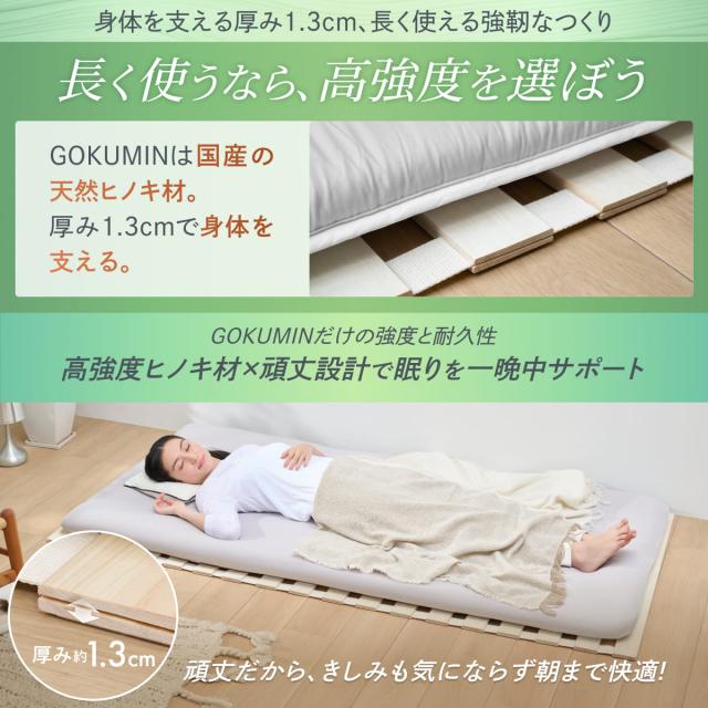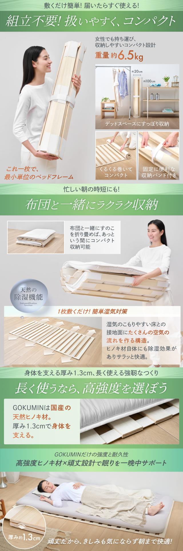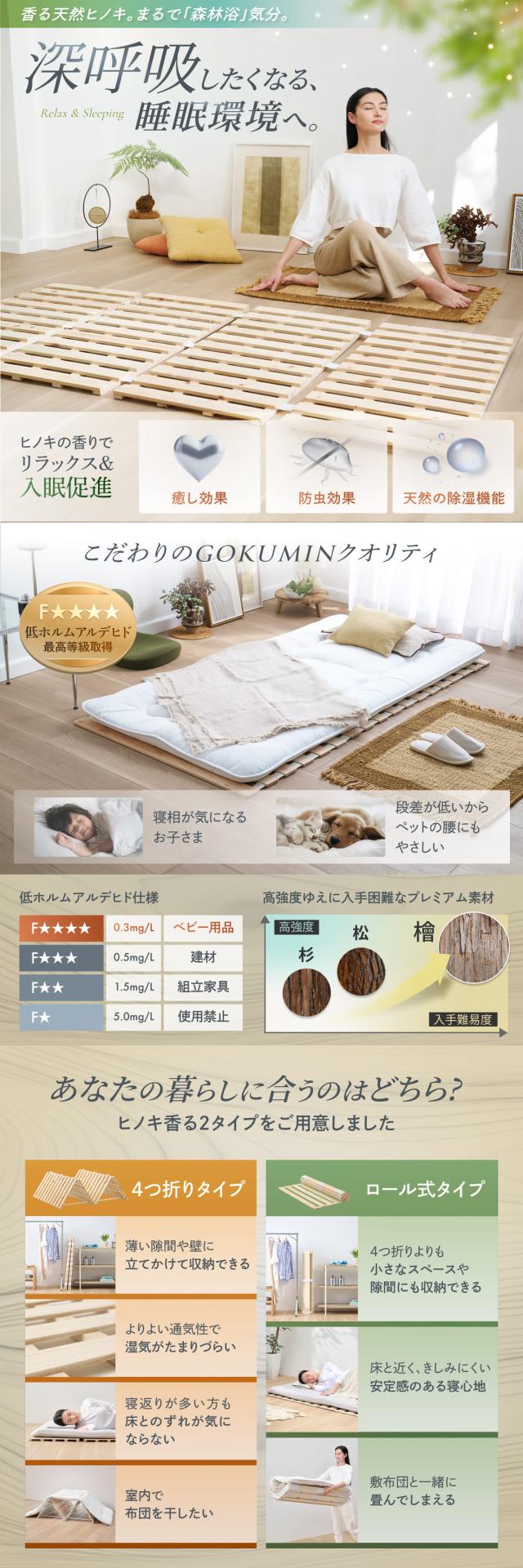 すのこマット シングル 国産ひのき すのこベッド GOKUMIN ロール式 四つ折り 4つ折り 頑丈 通気性 除湿 軽量 防虫 四つ折り コンパクト 組立不要 国産 天然 すのこ 1年保証 滑り止め 傷防止 室内干し ヒノキ 折り畳みベッド