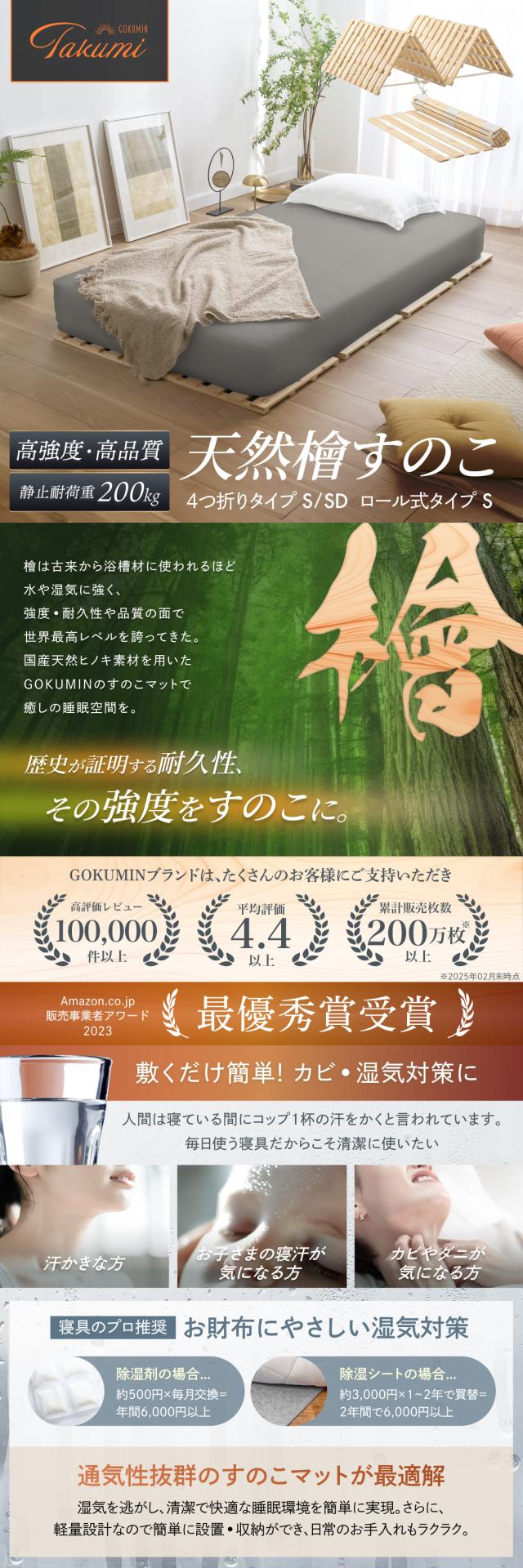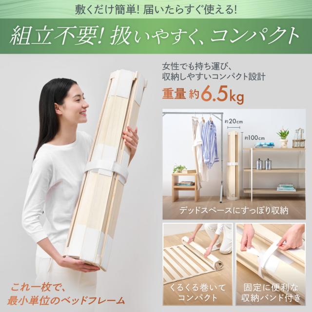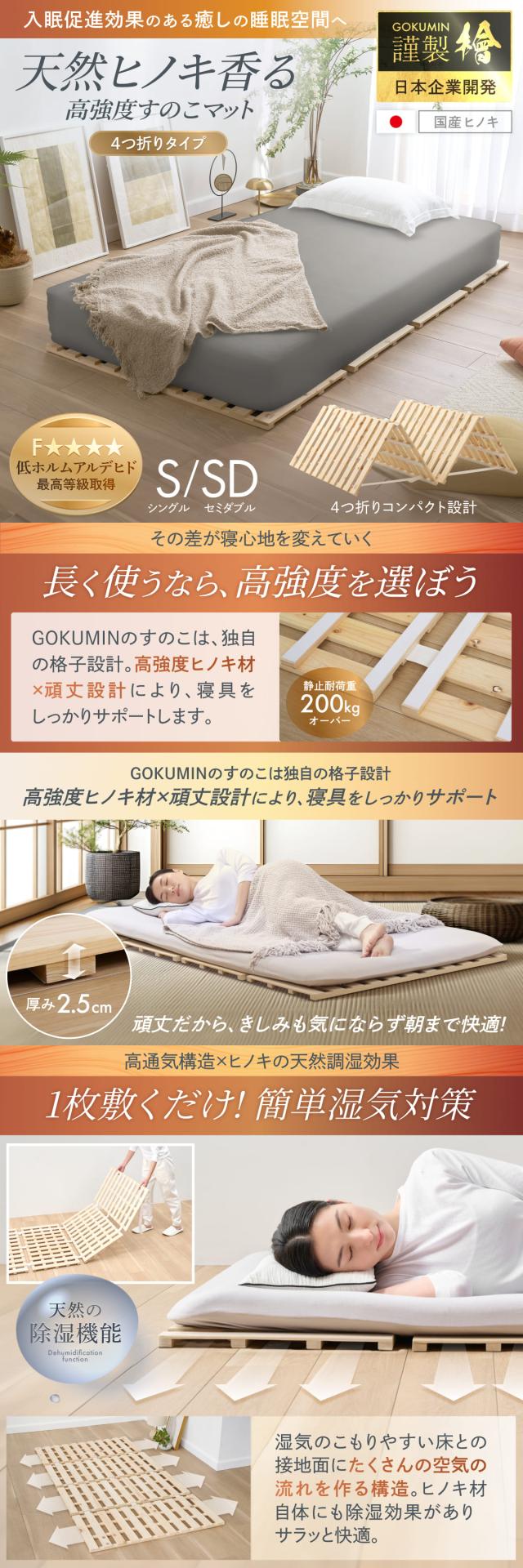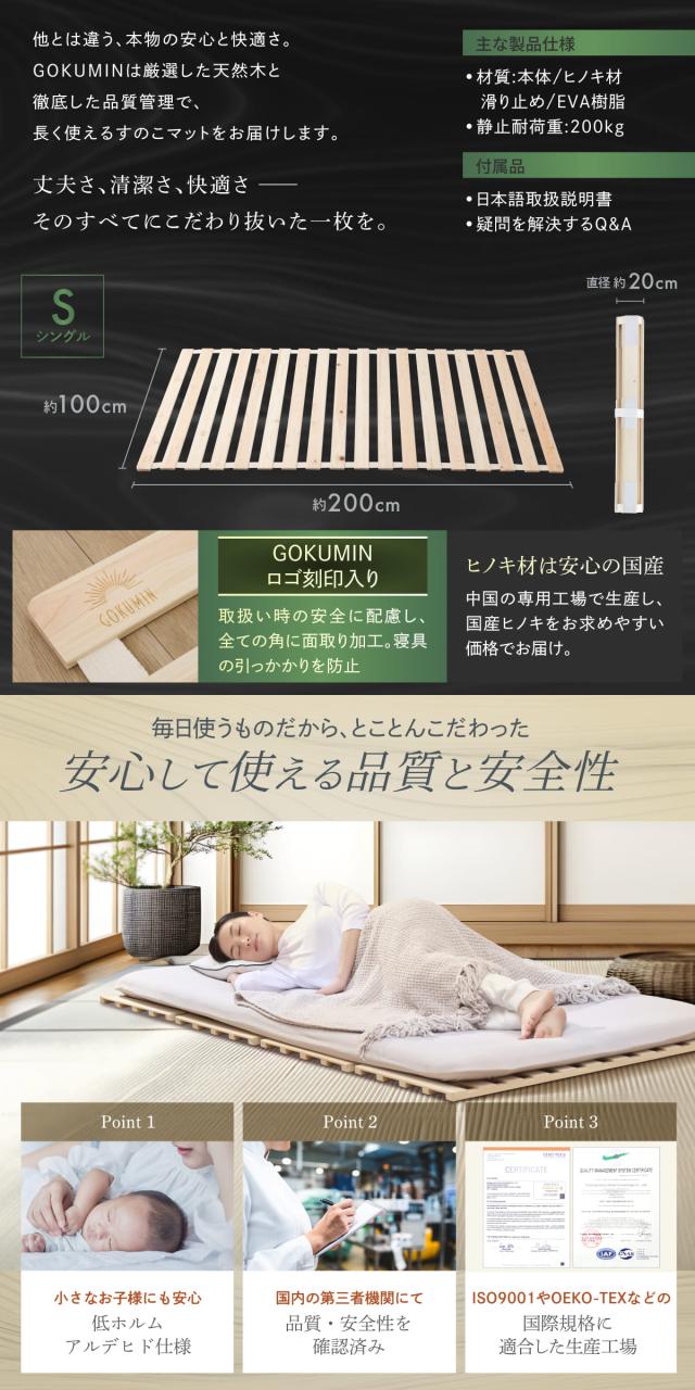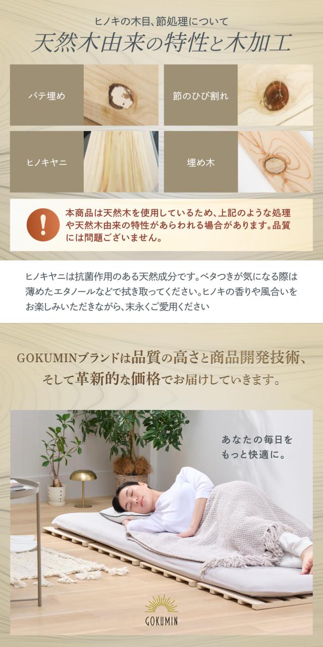 すのこマット シングル 国産ひのき すのこベッド GOKUMIN ロール式 四つ折り 4つ折り 頑丈 通気性 除湿 軽量 防虫 四つ折り コンパクト 組立不要 国産 天然 すのこ 1年保証 滑り止め 傷防止 室内干し ヒノキ 折り畳みベッド