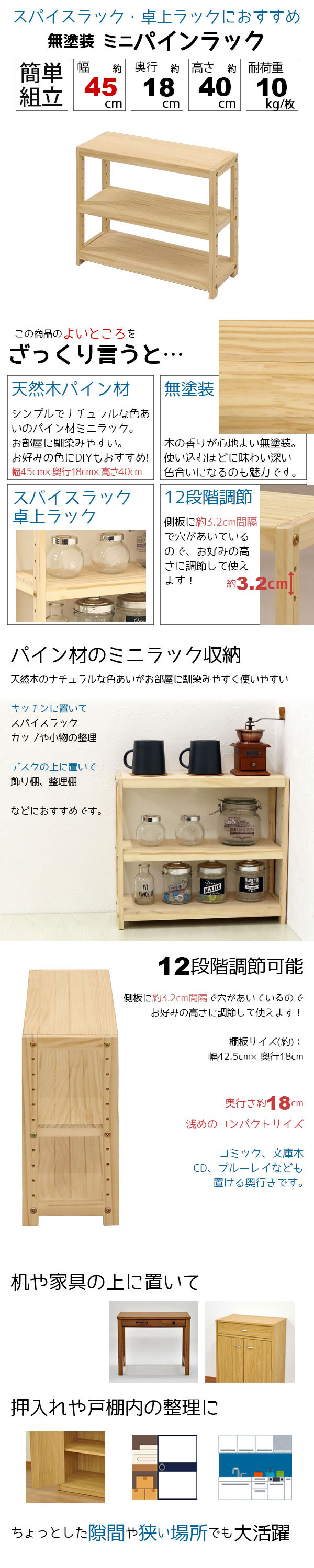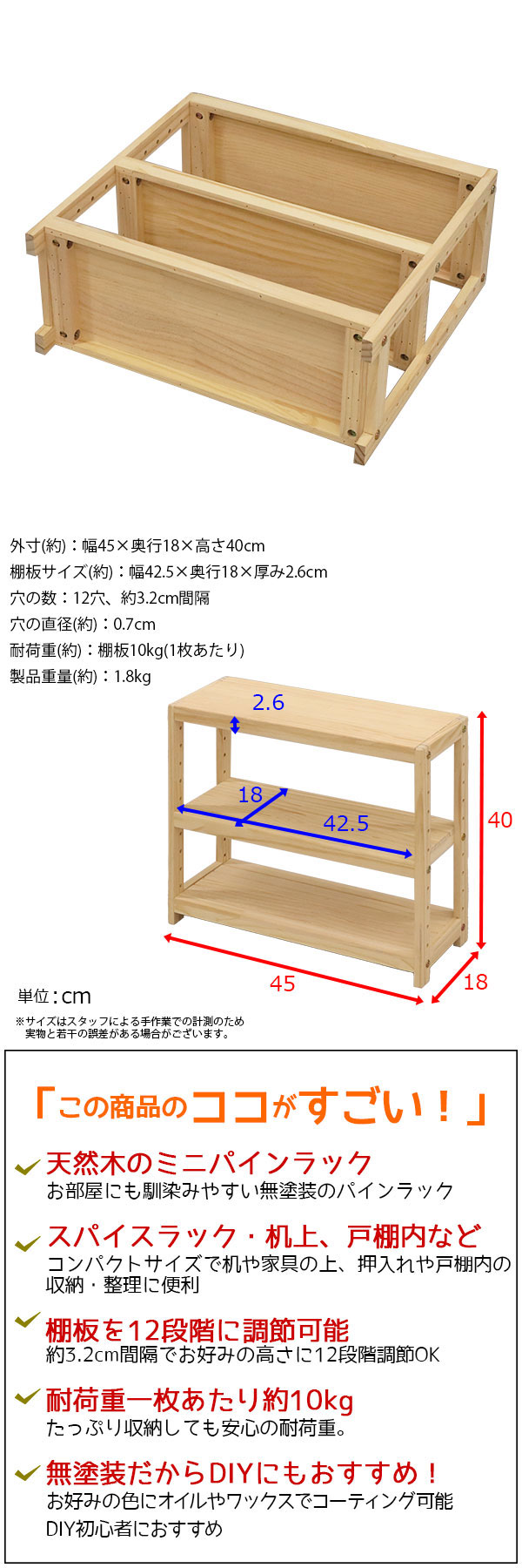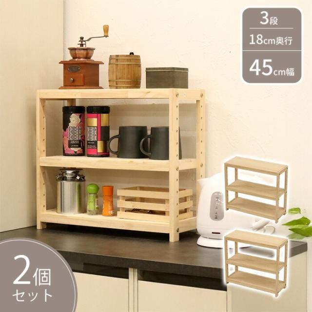 ミニラック 3段 2個セット 木製 卓上 奥行18cm(奥行20cm未満) 耐荷重30kg(棚板1枚あたり10kg) 頑丈 幅45cm 高さ40cm スパイスラック 卓上ラック パインラック 天然木無塗装 ナチュラル キッチン収納 デスク上ラック デスク収納 スリム 小さい すき間 狭い場所 省スペース