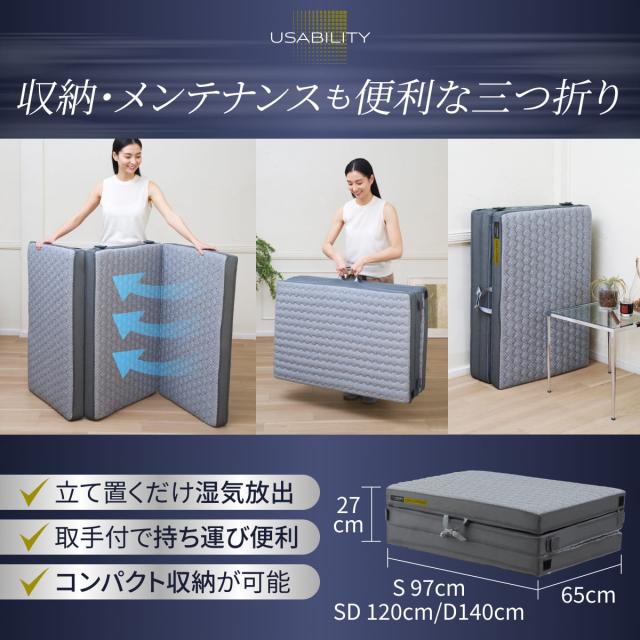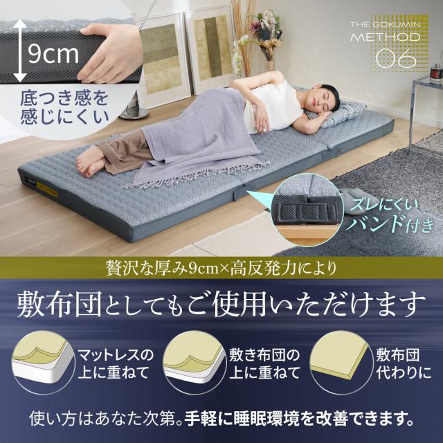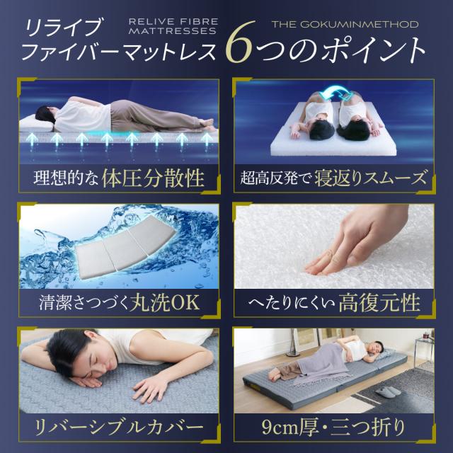 三つ折り マットレス 硬め 高反発 GOKUMIN 腰を支えるファイバーマットレス 厚さ9cm シングル 腰痛 腰対策 通気性 折りたたみ 折り畳み 洗える 丸洗い カビ 湿気 アレルギー 対策 リライブファイバーマットレス