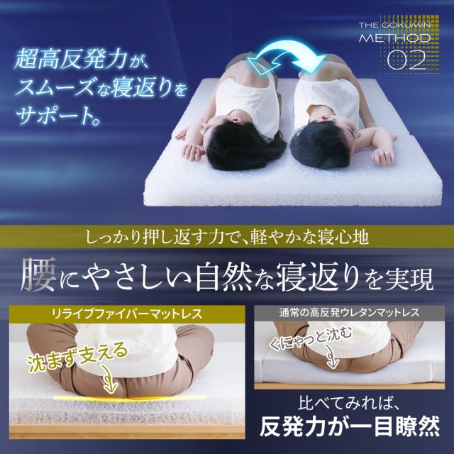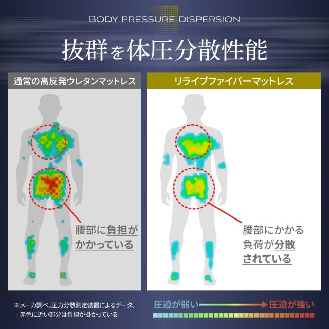 【100万本のファイバーが叶える、超体圧分散と超高反発力】リライブファイバーマットレスは、約100万本のファイバーが細かく沈み込み、腰や背中にかかる圧をバランスよく分散。自然な寝返りを促し、腰まわりへの圧力をやわらげます。ウレタン系マットレスを超える高反発力で、体をしっかり支え、深い眠りへと導きます。