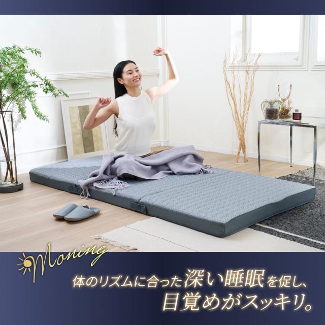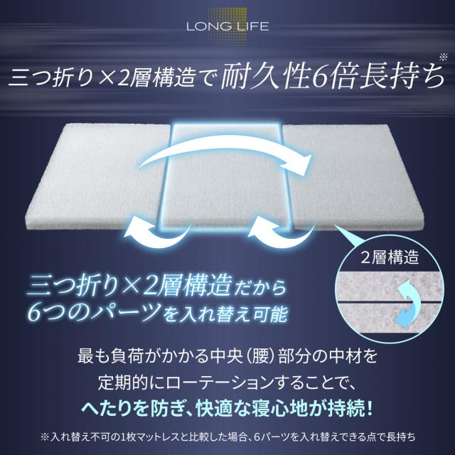 一枚ものマットレスは、負担のかかる部分から劣化してしまうもの。GOKUMINは 三つ折り×2層構造 により、 6つのパーツを自由に入れ替え可能 。特に圧力のかかる 腰部分の配置を変えることで、長期間快適な寝心地を維持 できます。買い替えの頻度を減らし、使い続けるほどに違いを実感できる設計です。