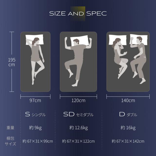 | サイズ・重量 | ・製品サイズ:約97×195×9cm ・製品重量:約9? ・梱包サイズ:約67×31×99cm |