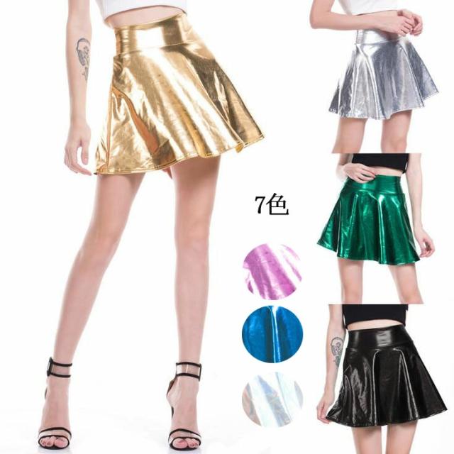 レザースカート レディースミニスカート ハイウエスト Aラインスカート 光沢スカート セクシー フェイクレザー ジャズダンス Jazz ダンス衣装 ステージ衣装 パーティー クラブ 金 銀 7色 黒
