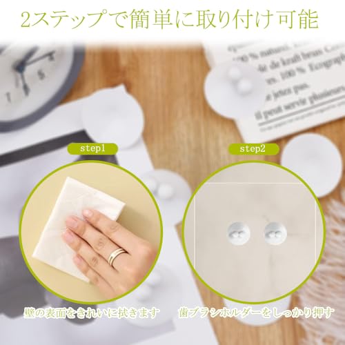 【取り付けが簡単】タオルで壁を拭いて清潔と乾燥を保ち、貼り付けるだけで、歯ブラシホルダーが空気を叩き出して壁に吸着する。工具もネジも不要で、壁に穴を開ける必要もない。