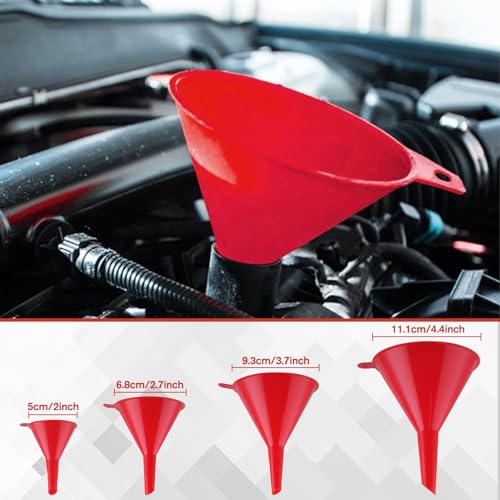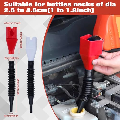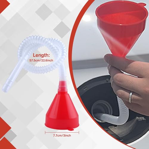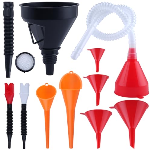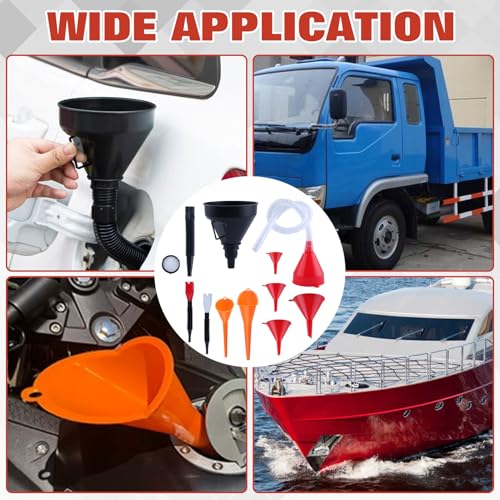 10の漏斗:完全な10部分の漏斗セットは異なった適用のためのさまざまなサイズそして様式を含んでいる: 黒い車の漏斗は効果的に不純物を取除くことができるフィルターが装備されている;赤い漏斗は、さまざまな角度で充填するのに理想的です。長いネックのオレンジ色の漏斗により、手の届きにくい充填ポートや狭いスペースに簡単にアクセスでき、キッチンや車に最適です