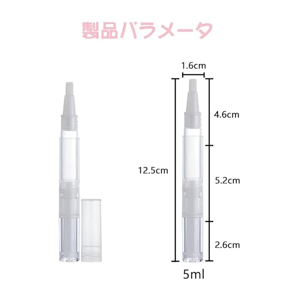 セット内容:ツイストペン 5本セット ;容量:5ml;プレス&スイベル・ディスペンサー・ペンは、持ち運びに便利なディスペンサー容器です。また、製品の衛生と品質を保つため、ペン先やライナーを定期的に洗浄・交換することをお勧めします。