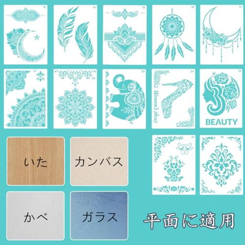 描画テンプレート 12枚セット 花 ボーダー 洗濯可能 再利用可能な 木製壁アート デザイン用 ペイント テンプレート 絵描き道具 DIY 花 羽 月 象 曼荼羅 ステンシル 手帳用テンプレート 絵画塗装道具