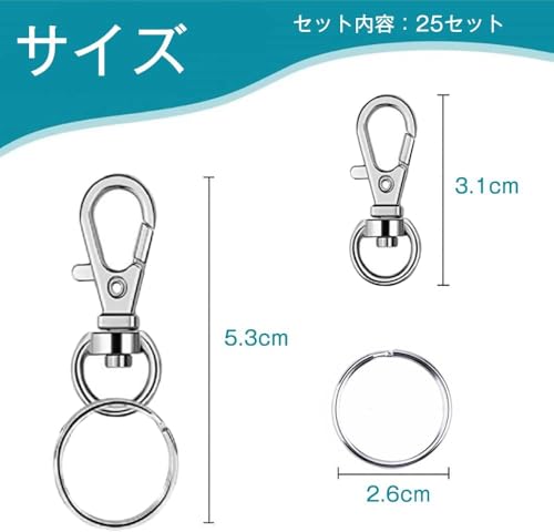 セット内容:25セット:25リング フック,25キーホルダー。カラー:シルバー。サイズ:全長5.3cm,リング フック:2.6cm,キーホルダー:3.1cm。