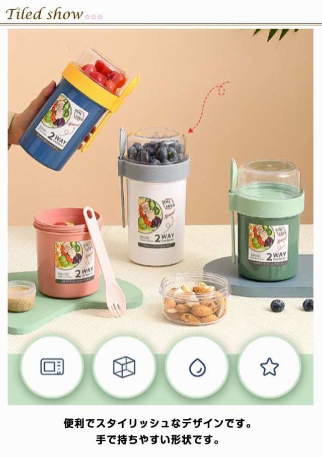 | 容器はボトル型で、持ち運びに非常に便利です。サラダ、フルーツ、スナック、牛乳などに使用できます。 ソースカップとフォークが付属しています。 容器の上部にはドレッシングを入れるカップが付いています。 容器は安心して使用できる素材で作られています。 フタを閉めると、シェイクしてドレッシングを混ぜることができます。 容器はお弁当袋に入れやすいサイズです。 ピクニックや外出先での使用に最適です。 便利でスタイリッシュなデザインです。 手で持ちやすい形状です。 お弁当箱としても使用できます。 カバンに入れて持ち運ぶことができます。 容器のサイズはコンパクトで、場所を取りません。 | |