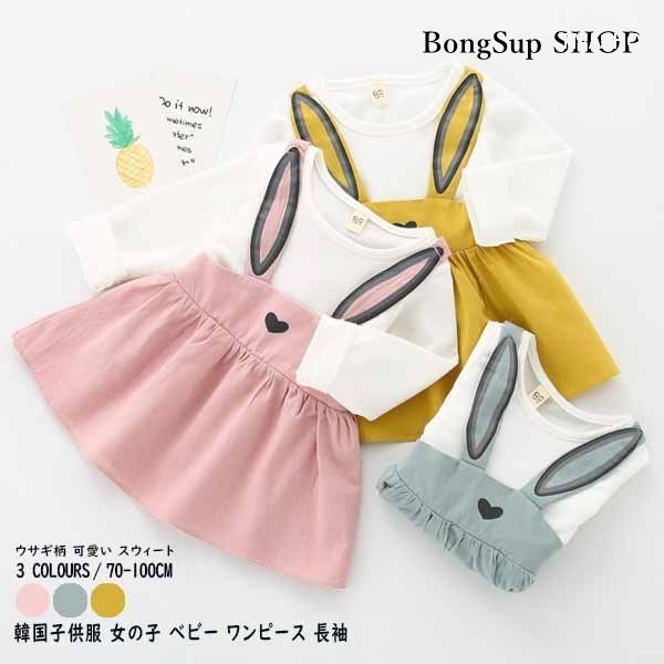 韓国子供服 女の子 ベビー ワンピース 長袖 ウサギ柄 可愛い スウィート 子ども服 ベビー服 春 秋ワンピ 普段着 通園 通学 ピンク イエロー 70 80 90 100cm