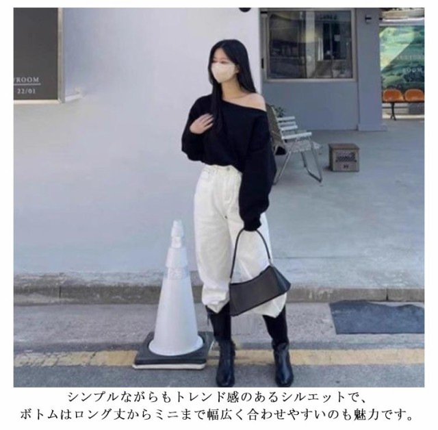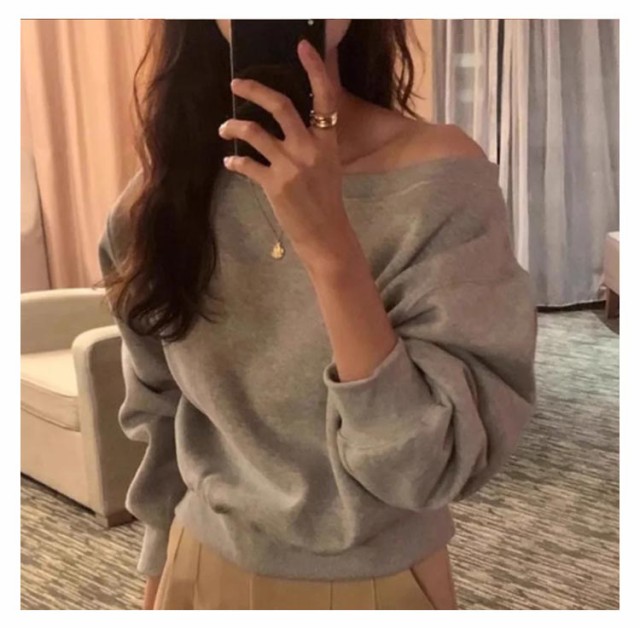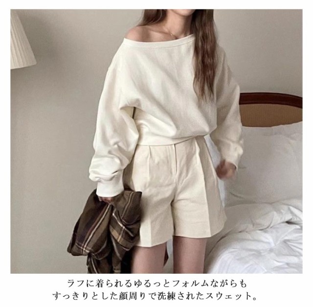 アシメ 無地 レディース ショート丈 長袖 トップス オーバーサイズ 春 秋 オフショルダー ゆったり オフショルダー アシンメトリー スウェット プルオーバー ボリューム袖 カジュアル 可愛い ワンショルダー 韓国ファッション ホワイト グレー