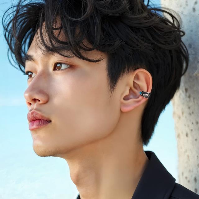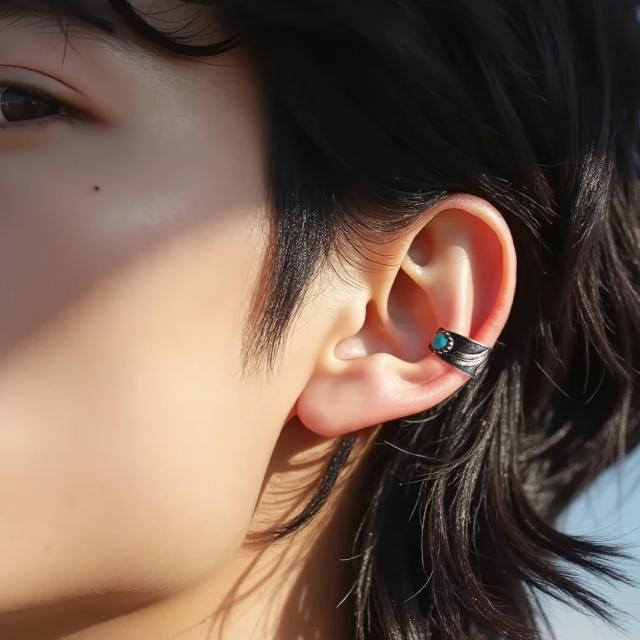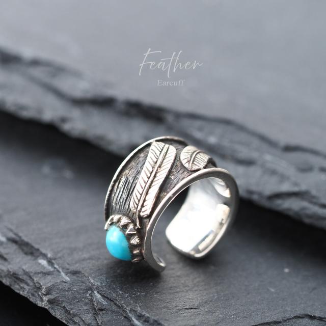 ネイティブアメリカンの羽根モチーフとターコイズを配しシルバー925製のイヤーカフ。羽根は自由や守護を、ターコイズは幸福と魔除けを象徴し、スピリチュアルな意味を持ったネイティブアメリカンの文化を感じさせる印象的なデザインで、身に着けるだけで意味あるおしゃれを楽しめます。カジュアルな装いに自然に溶け込み、ピアスホール不要の使いやすさも魅力。軽くて快適な着け心地と、燻し加工がもたらす深みが耳元を彩ります。幅広いファッションに馴染み、デニムやレザーとの相性も抜群。素材は高品質なシルバー925仕様。個性と伝統、気軽さを兼ね備えたイヤーカフは、日常にスピリットとアクセントを加える逸品です。