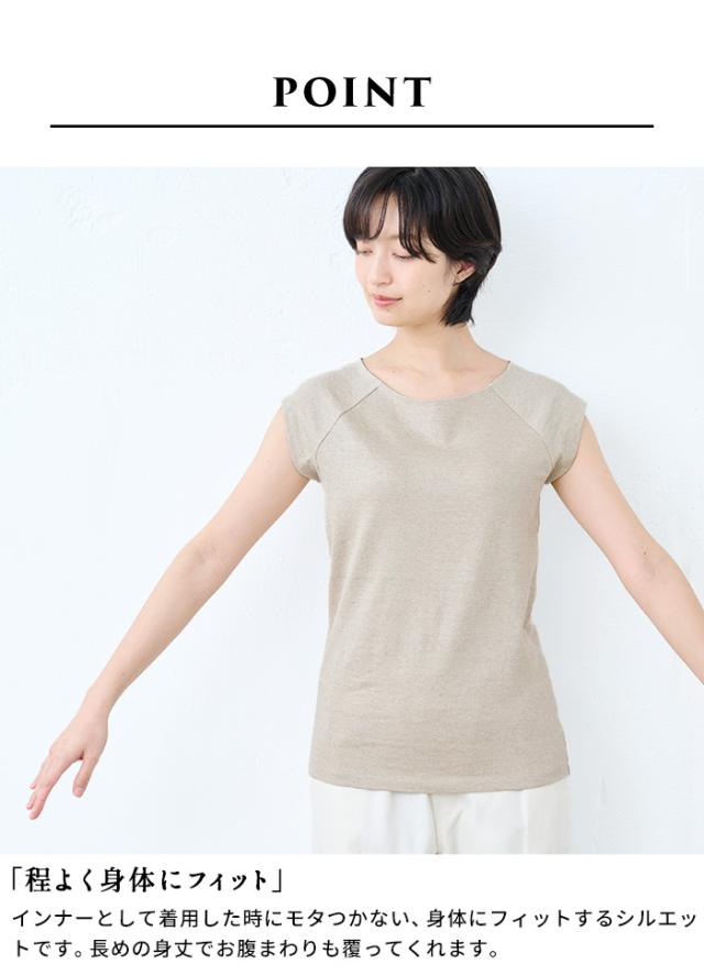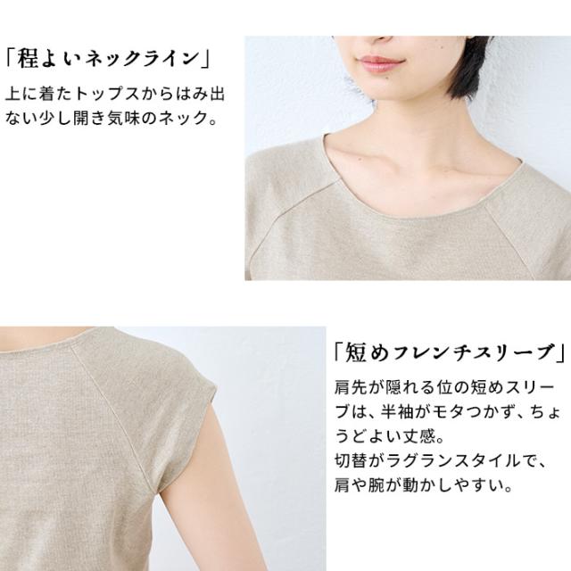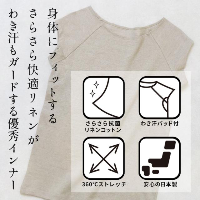 プレミアムリネン ストレッチ 汗取り フレンチスリーブ Tシャツ 日本製 / 汗取りインナー レディース tシャツ 脇汗 パッド付きインナー 40代 50代 60代 汗染み 汗染 防止 ワキ汗 汗取り パット付 フレンチ袖 リネン コットン 麻 綿 半袖 吸汗 吸水 速乾 抗菌