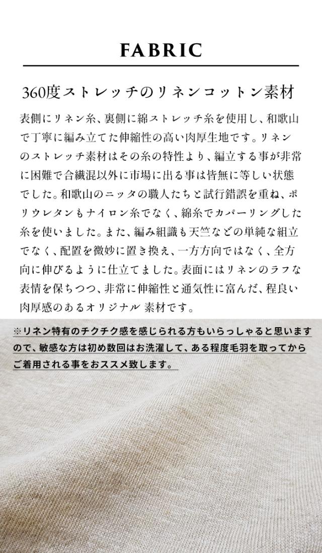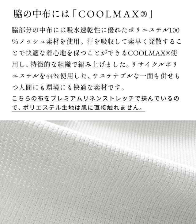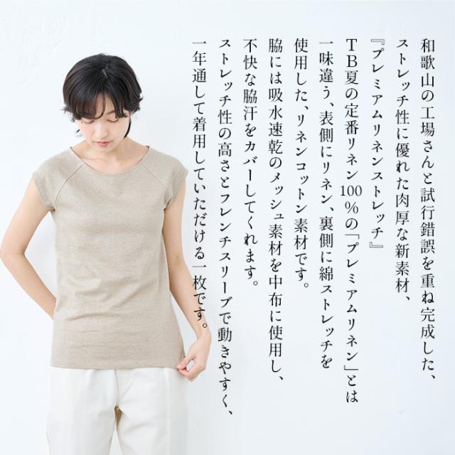 特徴 プレミアムリネン」シリーズに肉厚でストレッチ性の高い、新素材登場。身体にフィットするさらさら快適リネンがわき汗もガードする優秀インナー。和歌山の工場さんと試行錯誤を重ね完成した、ストレッチ性に優れた肉厚な新素材、『プレミアムリネンストレッチ』TB夏の定番リネン100%の「プレミアムリネン」とは一味違う、表側にリネン、裏側に綿ストレッチを使用した、リネンコットン素材です。脇には吸水速乾のメッシュ素材を中布に使用し、不快な脇汗をカバーしてくれます。ストレッチ性の高さとフレンチスリーブで動きやすく、一年通して着用していただける一枚です。