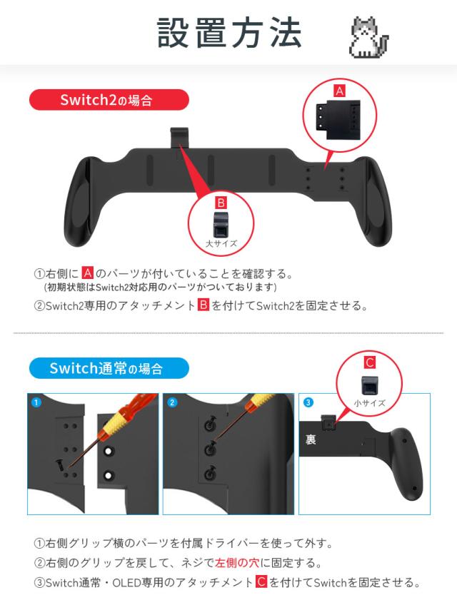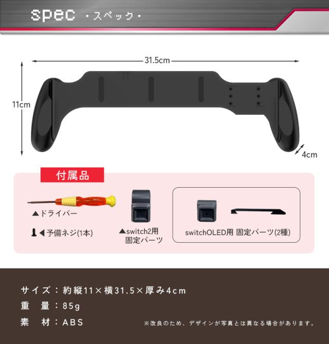 付属品:ドライバー×1つ 予備ネジ×1本 Switch2用固定パーツ Switch通常/OLED用固定パーツ(2種)