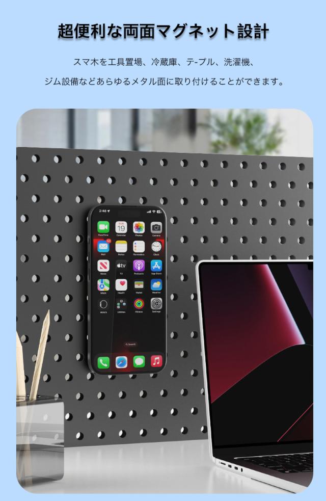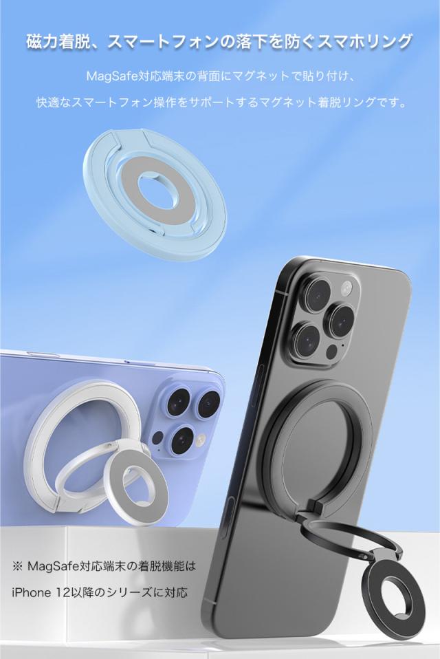 MagSafe対応端末の背面にマグネットで貼り付け、快適なスマートフォン操作をサポートするマグネット着脱リングです。