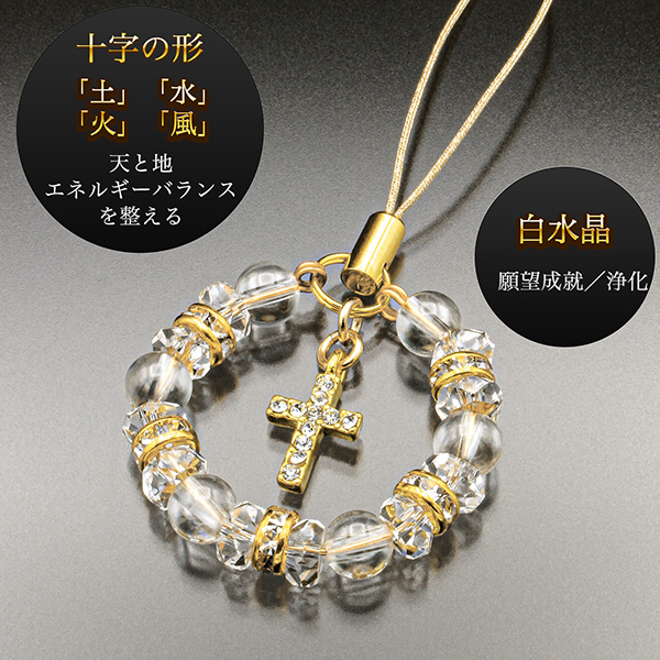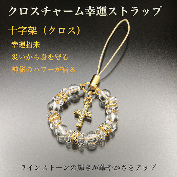 クロスチャーム幸運ストラップ ST_865‐十字架 クロス チャーム ストラップ 根付 開運 幸運招来 願望成就 浄化 白水晶 クリスタル