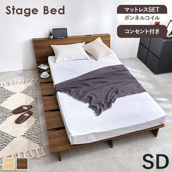 ベッド マットレス付き ステージベッド セミダブル ベッドフレーム すのこ ローベッド すのこベッド コンセント フロアベッド SD ロータイプ 宮付 ヘッドボード 宮棚 脚付き ルンバ モダン 頑丈 木製 ロースタイル おしゃれ