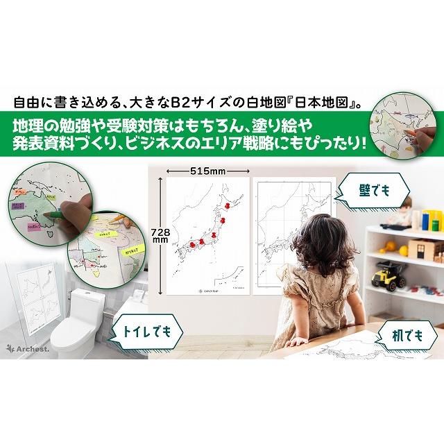 自由に書き込める、大きなB2サイズの日本地図ポスター。白地図だからこそ、自分だけの学びや表現が広がります。地理の勉強や受験対策はもちろん、塗り絵や発表資料づくり、ビジネスのエリア戦略にもぴったりです。