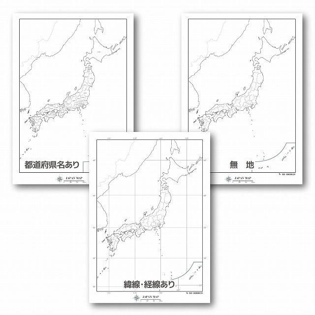 日本地図は、無地/県名あり/緯線経線ありの3種類です。いずれも県境線が印字されています。