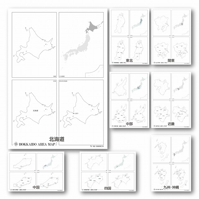 日本地方は、北海道/東北/関東/中部/近畿/中国/四国/九州・沖縄の8種類です。それぞれ「無地、日本地図、県名、県庁所在地名」の4種類が印刷されています。