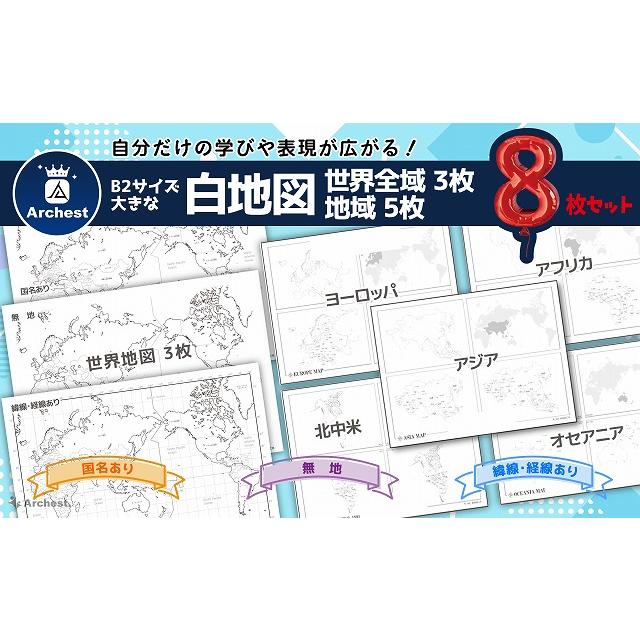 白地図 世界地図 8枚セット ワールドマップ B2(51.5×72.8cm) 経線 緯線 無地 5大陸 大判 壁掛け 小学生 中学生 高校生 夏休み 自由研究 受験勉強 地理 勉強 学習 学校 塾 業務用 営業マップ