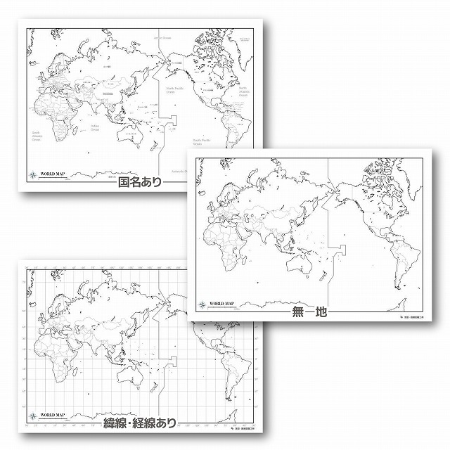 世界地図は、無地/国名あり/緯度経度ありの3種類です。いずれも国境線が印字されています。