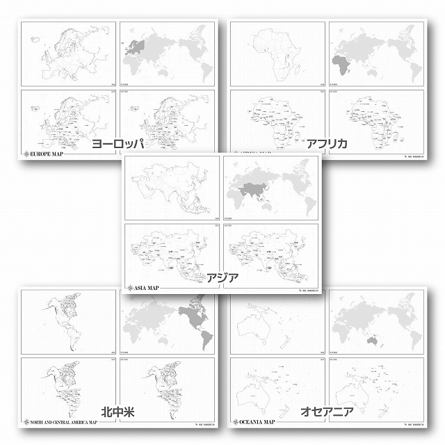 世界地域は、アジア/ヨーロッパ/アフリカ/アメリカ/オセアニアの5種類です。それぞれ「無地、世界地図、国名、首都名」の4種類が印刷されています。
