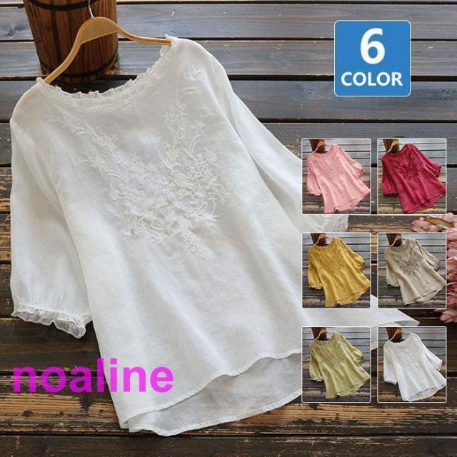 ブラウス リネンシャツ リネン 綿麻 シャツ 五分袖 レディース 刺繍 トップス きれいめ ブラウス 大きいサイズ 30代 40代 50代 体型カバー ゆったり