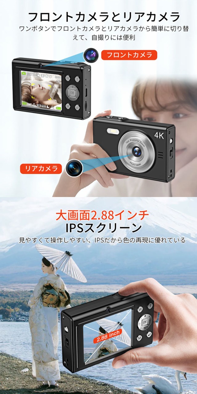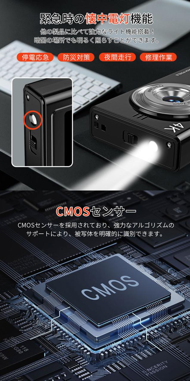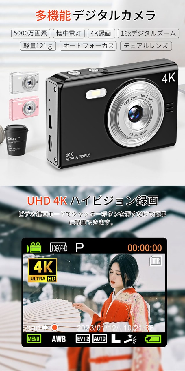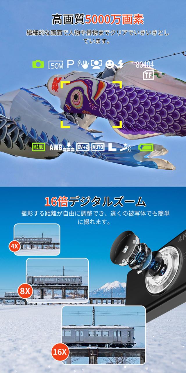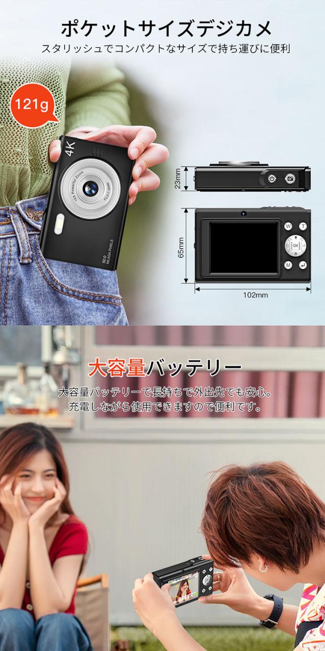 デジカメ デジタルカメラ 4K 4800万画素 16倍ズーム 高画質 オートフォーカス ウェブカメラ機能 広角レンズ 121g 手振れ軽減 防塵 軽量 初心者 新品
