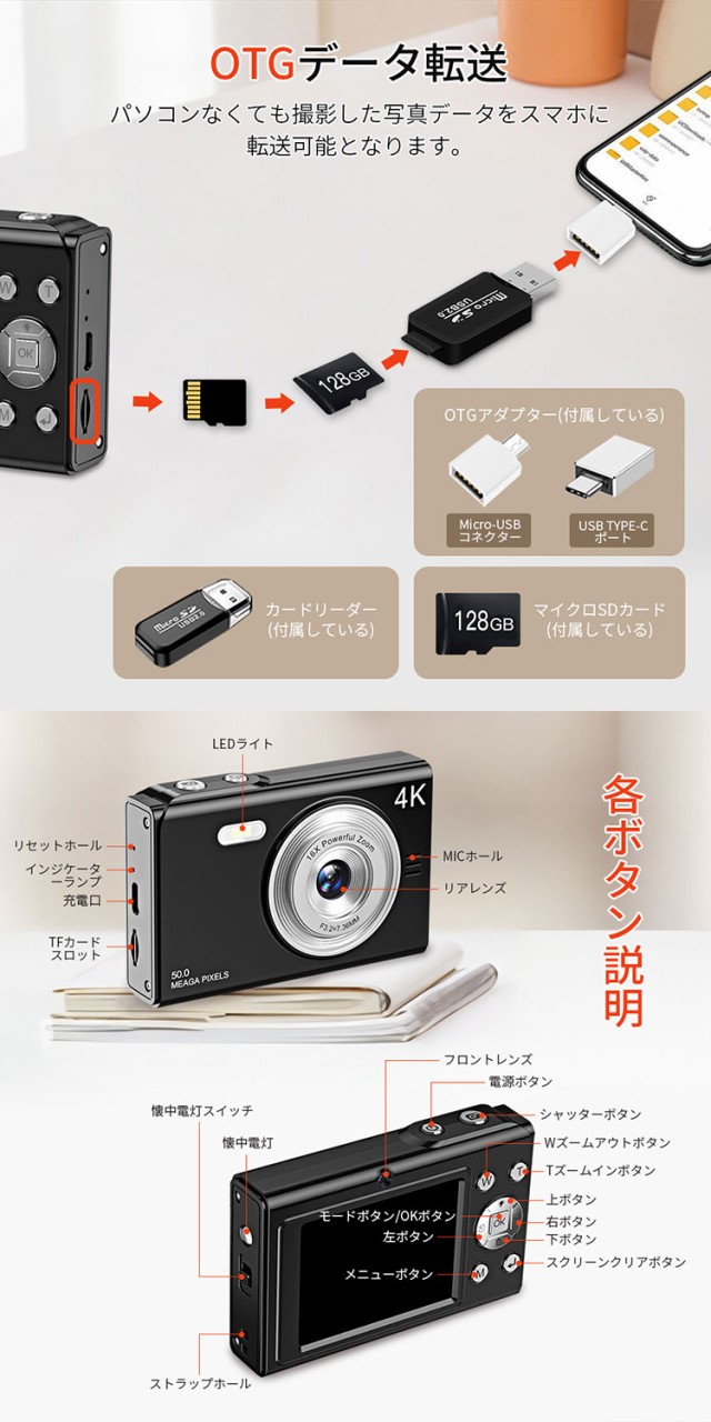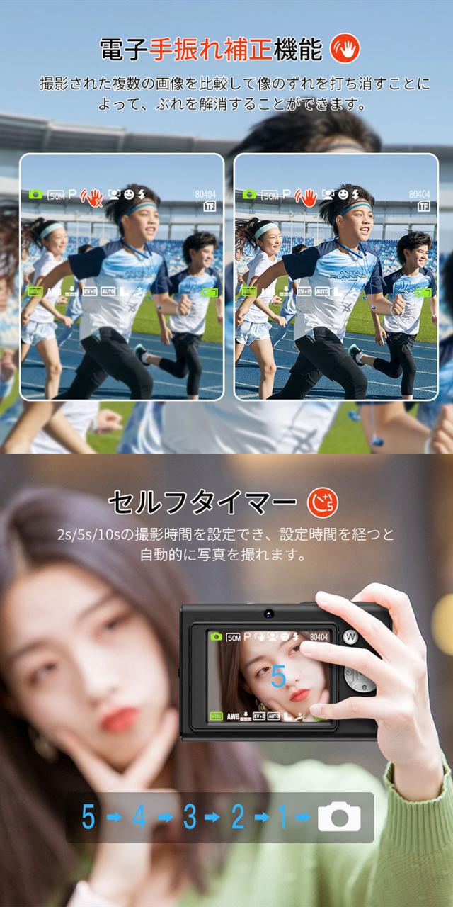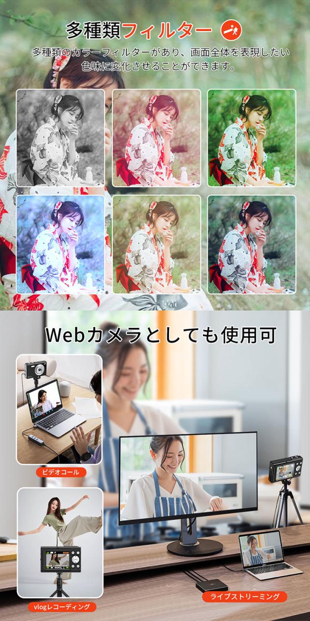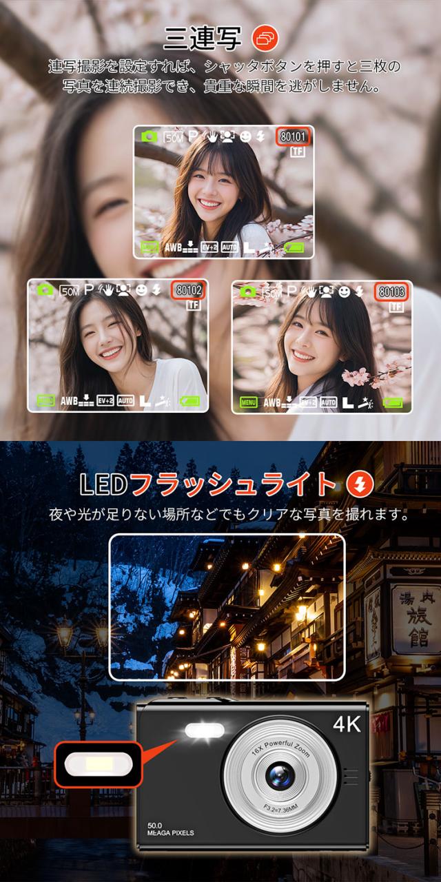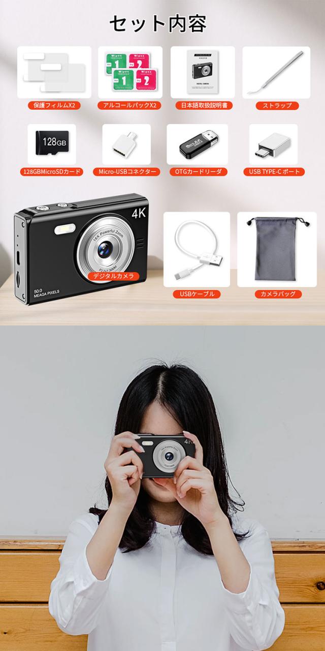 デジカメ デジタルカメラ 4K 4800万画素 16倍ズーム 高画質 オートフォーカス ウェブカメラ機能 広角レンズ 121g 手振れ軽減 防塵 軽量 初心者 新品