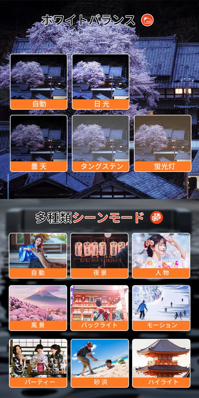 ホワイトバランス 自動/日光/曇天/タングステン/蛍光灯