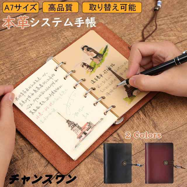 システム手帳 A7サイズ ミニ6穴 80枚 システム手帳 本革 メモ帳 無地 6穴リング リフィル付き 固定用ストラップ スリム 取り替え可能 本体 レザー カバー アンティーク リフィル リング内径15mm 就職 入学 プレゼント メモ帳 文房具 筆記 メンズ レディース おしゃれ レトロ