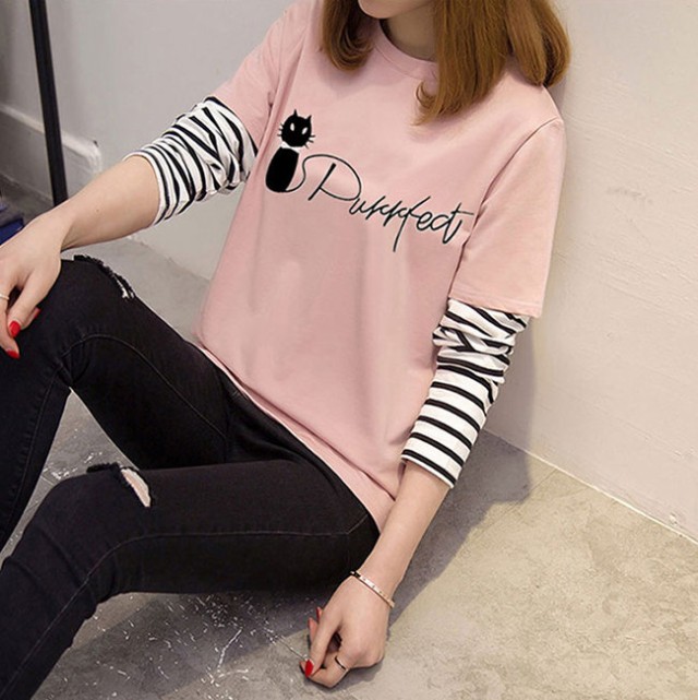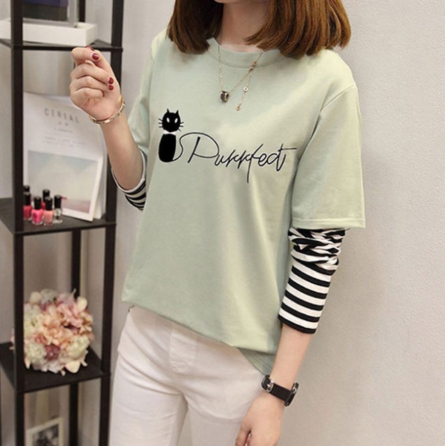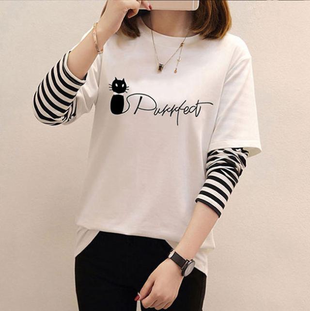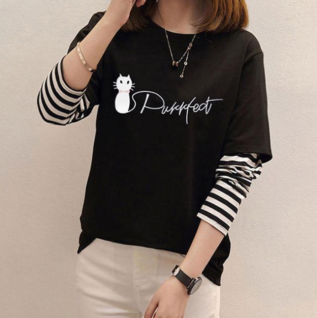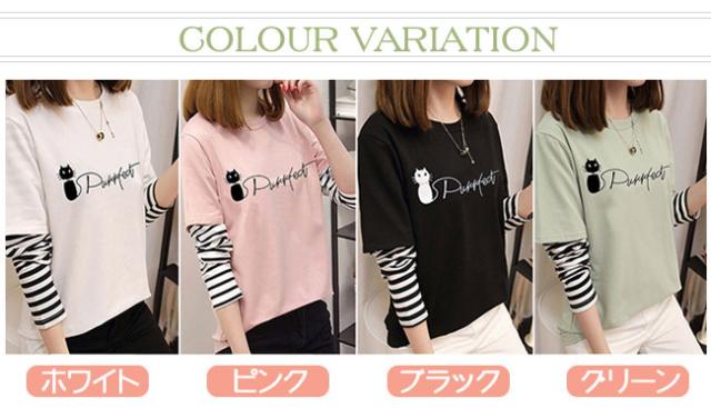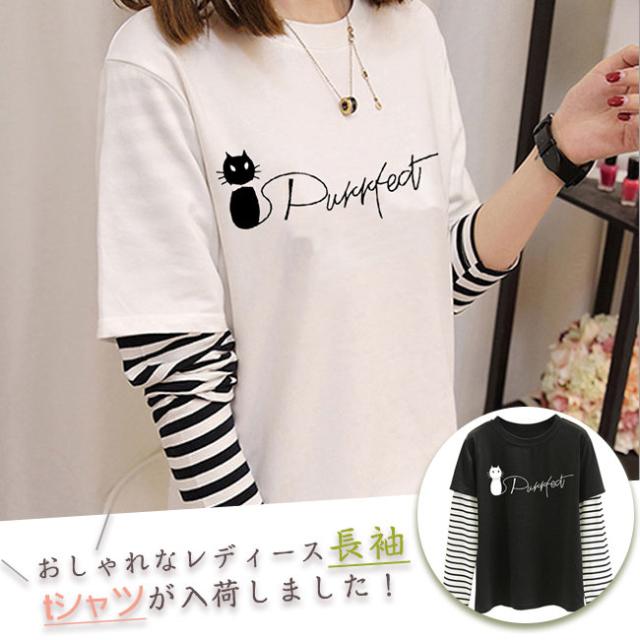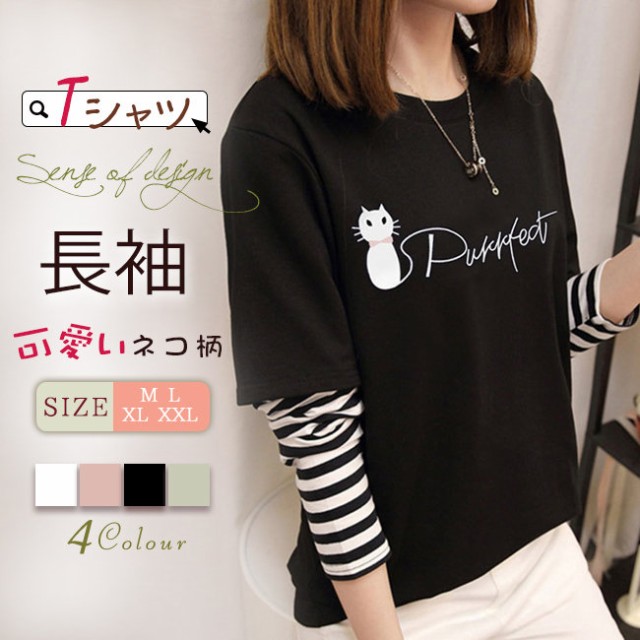 在庫限り Tシャツ レディース 長袖 トップス tシャツ クルーネック カジュアル おしゃれ 大きいサイズ 可愛い猫柄 体型カバー 通勤