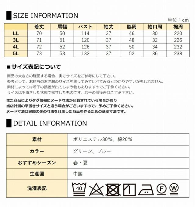 5L:着丈73 肩幅53 バスト132 袖丈37 脇周52 袖口周36 裾周238