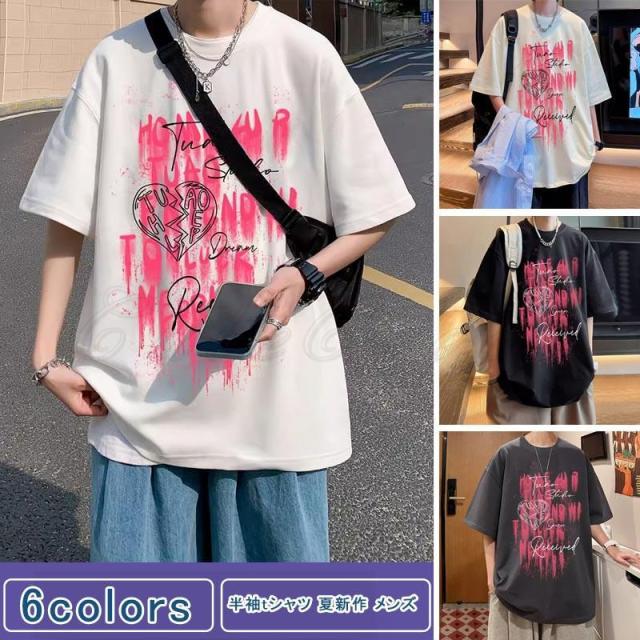 Tシャツ メンズ 半袖 ドロップショルダー 落書き オーバーサイズ tシャツ クルーネック コットン カットソー ロング丈 ゆったり 通勤 通学 白 黒 春 夏