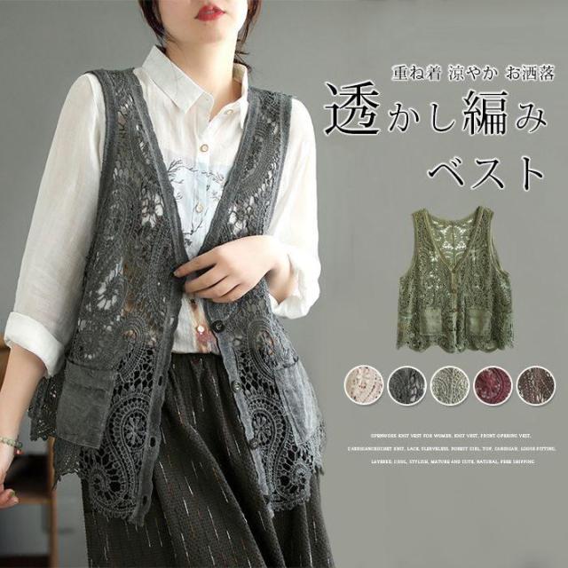 ベスト レディース カーディガン トップス ノースリーブ 透かし編み ニットベスト 前開き クロシェ編み かぎ編み レース カーディガン ゆったり 重ね着 涼やか お洒落 大人 可愛い ナチュラル レイヤード
