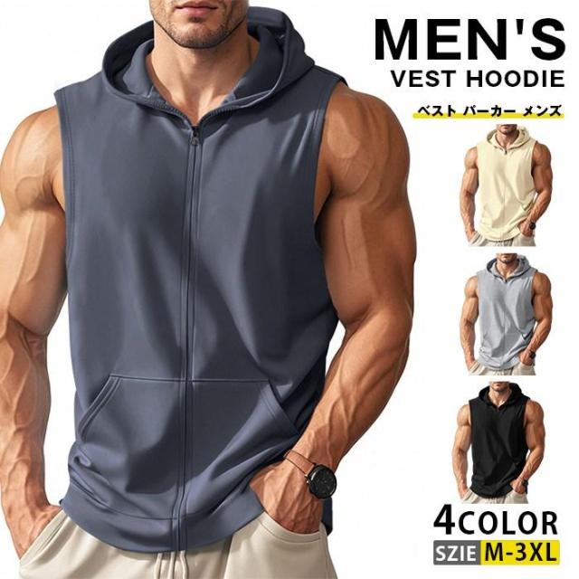 ベスト パーカー メンズ トップス 前開き ノースリーブ 重ね着 フード付き 無地 ジップアップ カーディガン スウェット おしゃれ お洒落 ナチュラル シンプル カジュアル 夏